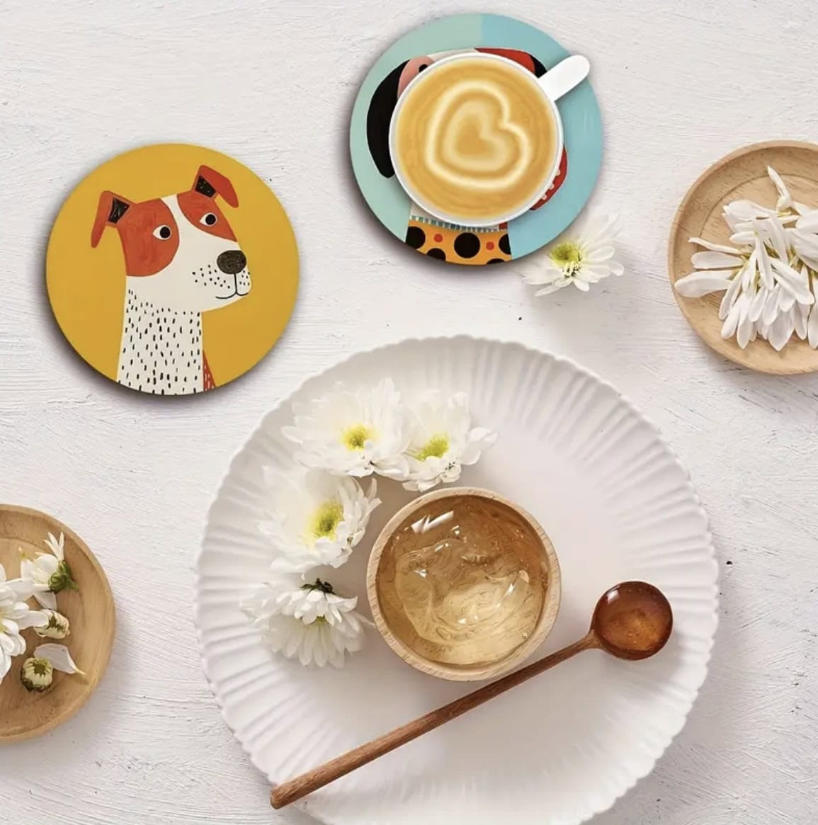 Bring color, creativity, and canine charm to your coffee table with these delightful wooden coasters